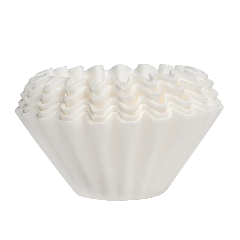 A diferencia de los filtros cónicos tradicionales, este formato basket promueve un lecho de café más compacto y uniforme, similar a un “cake”. Las ondas verticales permiten un flujo descendente pareja, mientras que la base plana maximiza el contacto entre el agua y las partículas de café, reduciendo el riesgo de canales y sobreextracción.